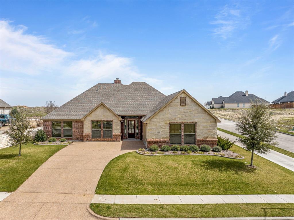 Built in 2021, this delightful single-story home sits on a prime corner lot across from Whitestone Golf Course, offering picturesque views and easy access to a shaded walking trail leading directly to the course. Spanning 2,618 sq. ft., the interior is bright and airy, featuring light wood floors and an inviting open-concept layout that seamlessly connects the living, kitchen, and dining areas. A wall of windows fills the living space with natural light, while a gas fireplace adds warmth and charm. The kitchen boasts a large center island with seating, a walk-in pantry, stainless steel appliances, and an adjacent dining area. The primary suite is a retreat with a huge walk-in closet and an ensuite bathroom featuring dual sinks, a soaking tub, and a separate shower. Additional highlights include a 2-car garage with extra driveway parking and a low-maintenance backyard with a covered patio, ideal for outdoor relaxation. With golf course views and modern comforts, this home offers the perfect blend of convenience and tranquility in a sought-after location.