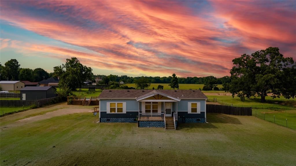 Come discover the home you’ve been dreaming of—Country living at its best where comfort, beauty, and lasting memories await you! This charming doublewide manufactured home is a 3 bedroom 2 bath nestled on nearly one acre of serene land, offering the perfect blend of peacefulness and space. Inside, you'll find plenty of natural lighting, a well-designed layout that maximizes both functionality and style and recently installed new flooring. The spacious open-concept living area is perfect for entertaining, while the modern kitchen features ample counter and cabinet space along with a large kitchen island and spacious dining area. The bedrooms are generously sized, providing a cozy retreat at the end of the day. The primary bedroom has a large walk-in closet, an en-suite bath with a walk-in shower, dual sinks on one vanity and a second makeup vanity. Outside, the expansive yard offers endless possibilities for gardening, outdoor activities, or simply relaxing in the tranquility. There are two back porches (one with a ramp), there is also a storage shed, and a fenced backyard. This home is located just a few minutes from Alba-Golden ISD, and within 10 minutes of Lake Fork or shopping and dining in Mineola. Whether you're looking for a peaceful escape or a place to host gatherings, this property has it all. Don't miss the opportunity to make this beautiful home your own. Book a showing today to experience firsthand what all it has to offer and what makes it a place you'll love to call home!