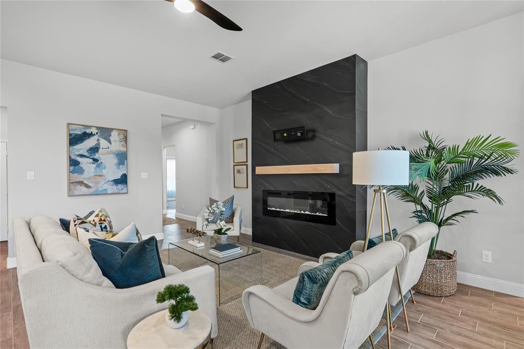Welcome to the community of Morningstar, you will be greeted by the beautiful lake that terraces down the right side of the neighborhood. You will see home owners fishing, running and biking and enjoying their amenities. There are 2 beautiful pools, basketball courts and playground equipment. The club house is awesome, one of the best master planned communities available in this area. Built by Impression Homes in 2022, this home is like new, impeccable, very lightly lived in and move-in ready. The home is staged so that you can see the livability and open floor plan designed for entertaining and family gathering. A truly unique and beautiful focal point of the living room features a built in electric fireplace resting on a stunning black wall with a TV mount above the fireplace designed by the homeowner and also provides optional additional heat to the room. The house also has an additional larger covered patio area across the back giving you nice space for grilling or relaxing. The home location is just 2 blocks to the new Elementary school. The large primary bedroom features a bay window area proving a nice additional seating area. Morningstar, welcomes you with one of the most spectacular entrance of any neighborhood with a fishing lake, walking and bike paths, the pools and playground. The MUD notice is in the transaction desk for review.